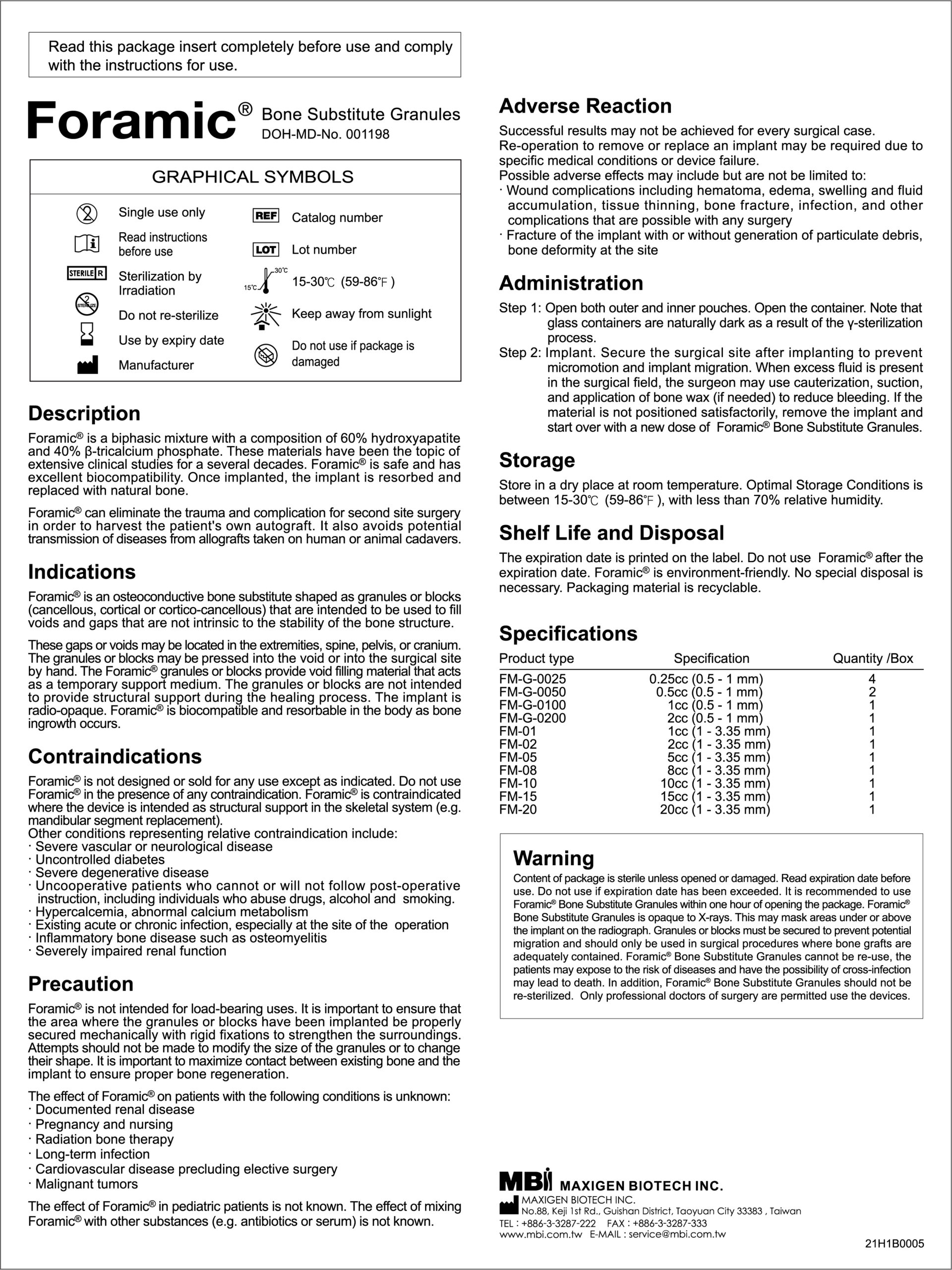 These gaps or voids may be located in the extremities, spine, pelvis, or cranium. The granules or blocks may be pressed into the void or into the surgical site by hand. The Foramic granules provide void filling material that acts as a temporary support medium. The granules are not intended to provide structural support durring healing process. The implant is radio-opaque. Foramic is biocompatible and resorbable in the body as bone ingrowth occurs.